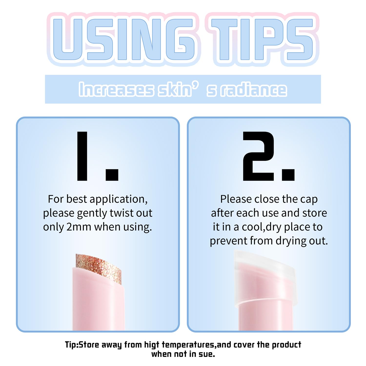 - Using Tips: 1. For best results, twist out only 2mm of the product during use to prevent breakage. 2. Always close the cap tightly after each use and store in a cool, dry place to maintain product quality. Tip: Avoid high temperatures and keep the cap securely closed when not in use to prevent drying out.