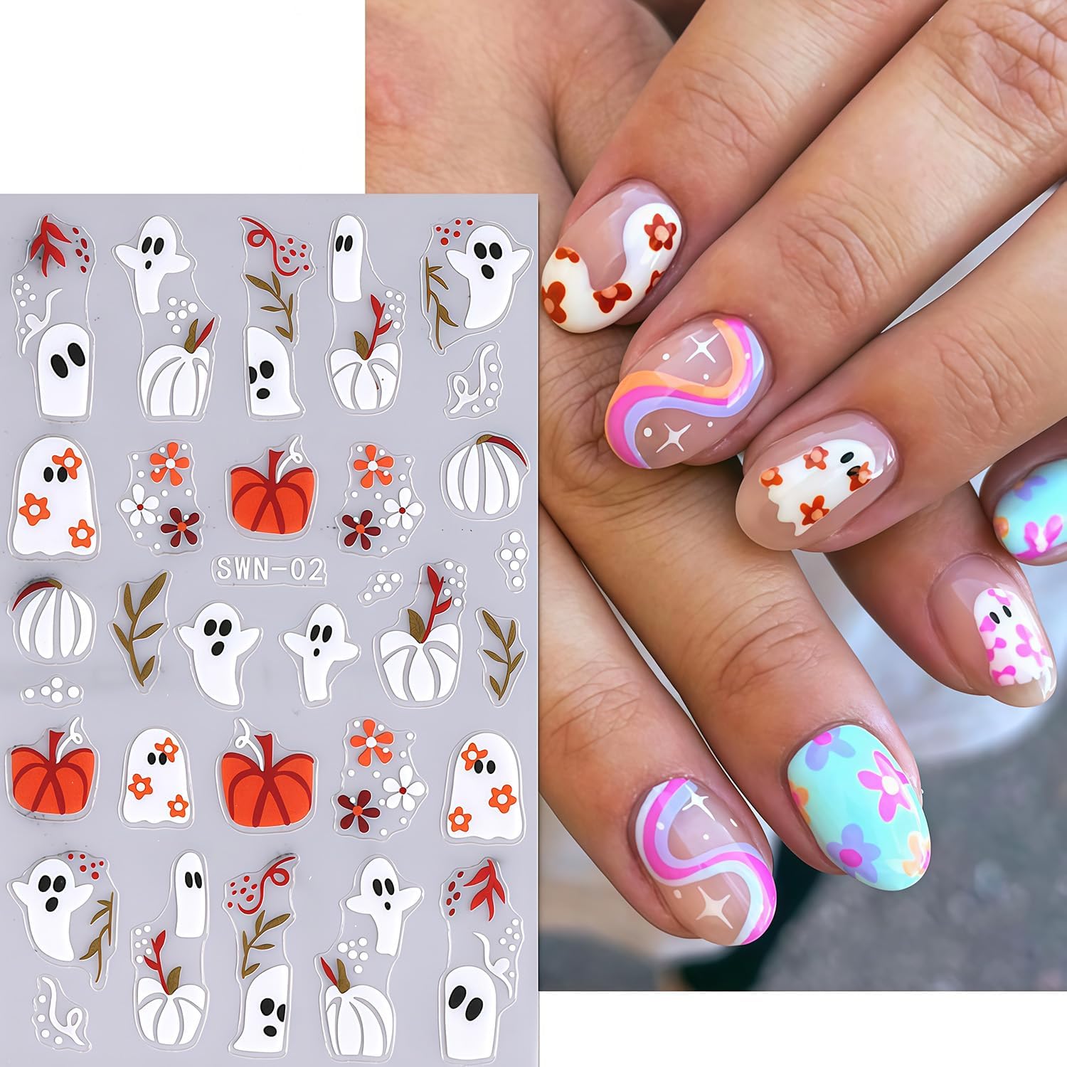 - Quantity: You will get 6 sheets of ghost nail stickers, including cute pumpkin and spider web designs, not easy to fall off or fade, can easily create a variety of themed nail art, meet the needs of reusable