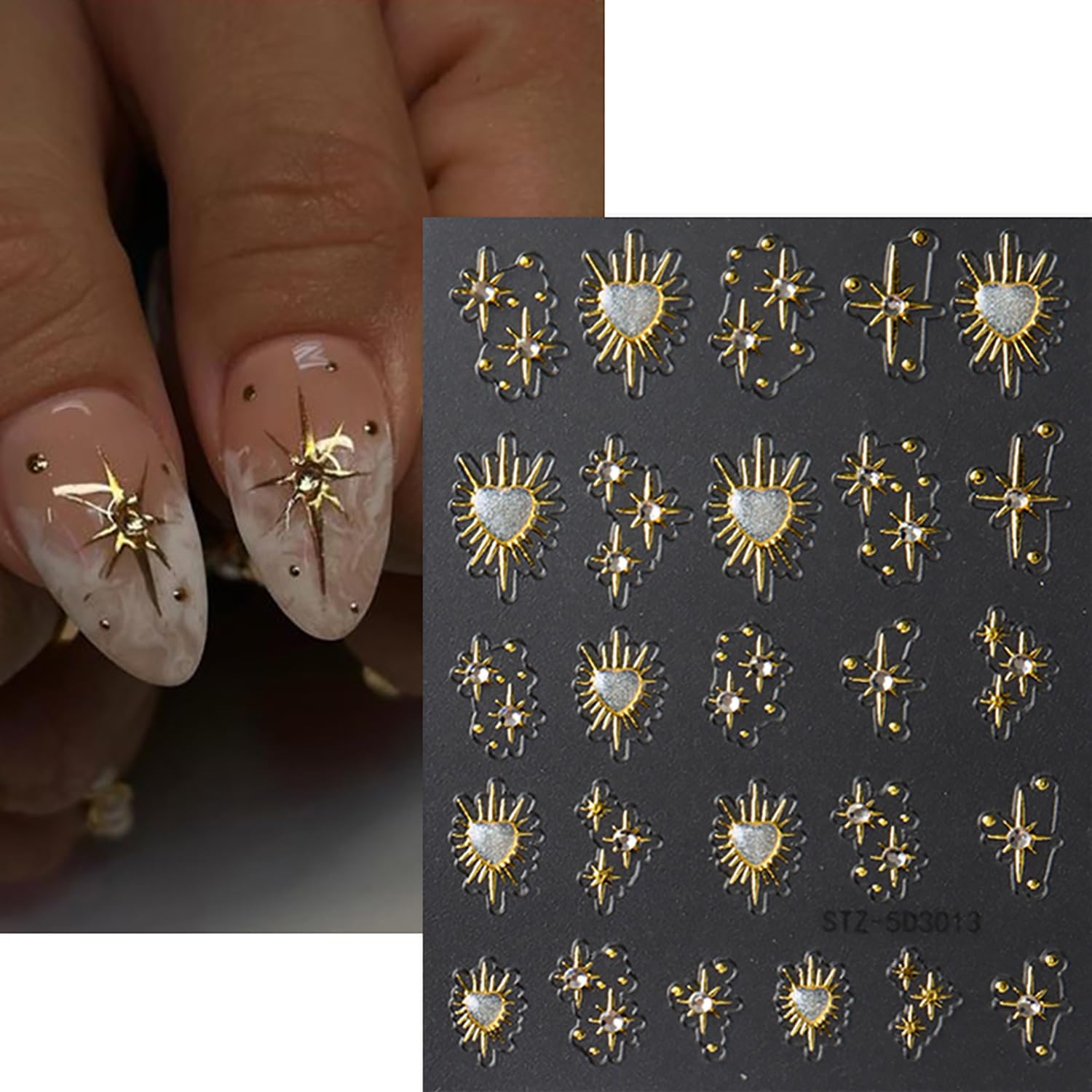 5D Star Nail Art Stickers Gold Nail Decals Rhinestone Design 2PCS Embossed Self-Adhesive Heart Star Moon Nail Supplies DIY Slider Manicures Accessories Stars Nail Art Stickers for Women Decorations