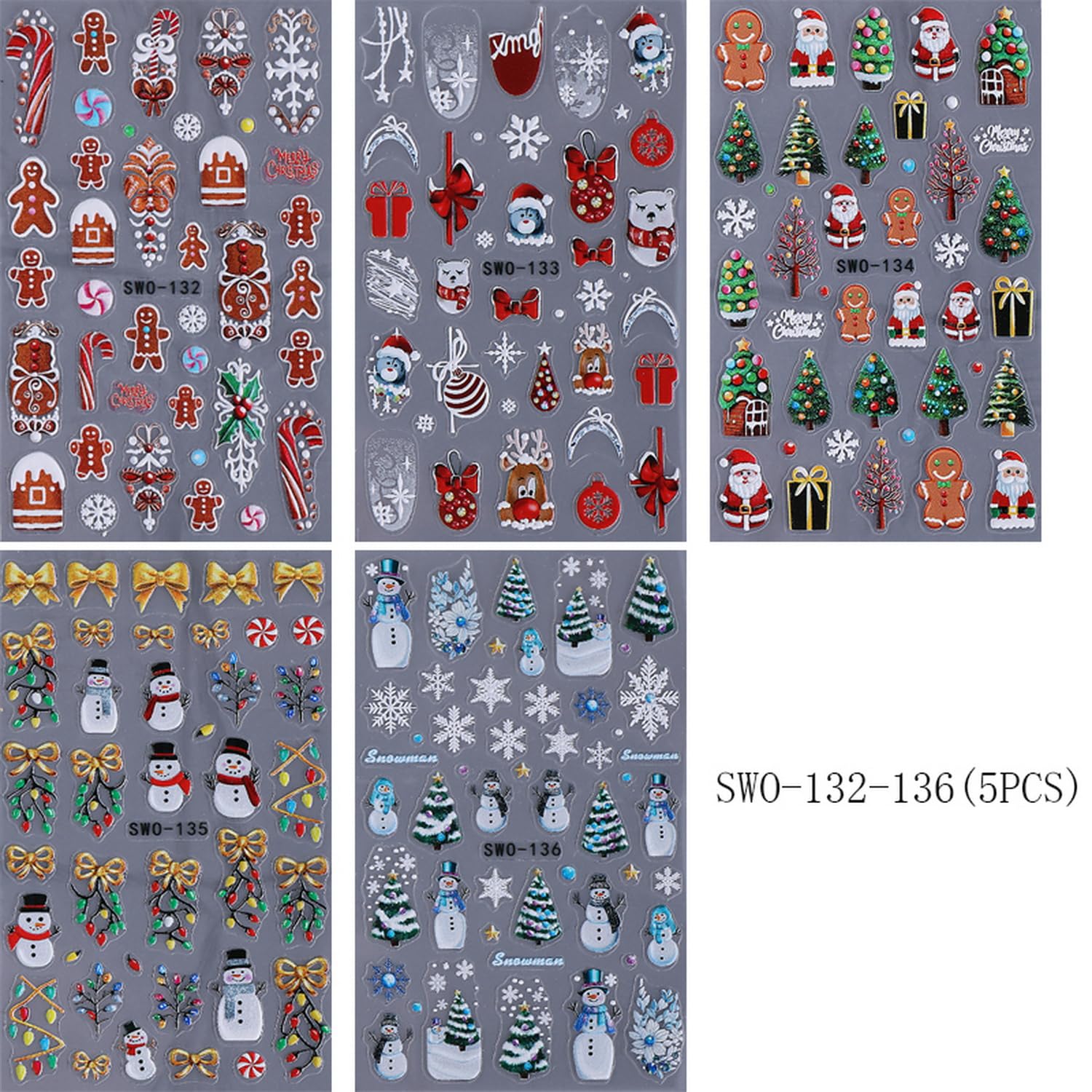 - Festive Designs: Includes 5 sheets of Christmas nail art stickers featuring adorable Santa Claus, reindeer, and gingerbread man designs for a fun holiday look